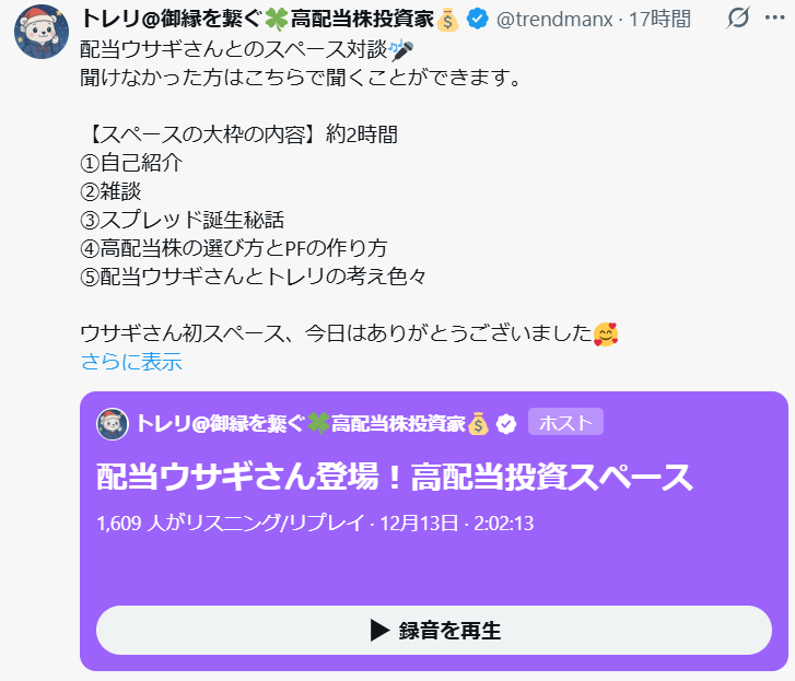 配当ウサギさんとのスペース動画はこちらで確認できます▼
